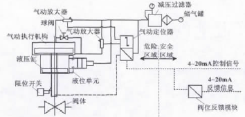 圖2 電氣定位器控制原理圖 3 現(xiàn)有調(diào)節(jié)閥安全模式 3.1 方案分析 氣動調(diào)節(jié)閥實現(xiàn)了出站壓力的調(diào)節(jié)控制,電氣定位器能夠使其在全行程上進行移動。執(zhí)行機構可以連續(xù)地做增壓或者減壓的調(diào)整,以達到較好的控制效果。但調(diào)節(jié)閥執(zhí)行機構存在故障狀態(tài)下安全模式選擇的問題。安全模式的選擇首先要保證生產(chǎn)的安全性,其次是生產(chǎn)的連續(xù)性。由于長輸管道的特殊性,要求當調(diào)節(jié)閥出現(xiàn)故障時,調(diào)節(jié)閥處于保位狀態(tài)。 3.2 保位措施 調(diào)節(jié)閥的故障狀態(tài)有斷氣、斷電和斷信號三類。 在斷氣故障狀態(tài),連接到液壓單元的氣壓信號中斷,液壓單元的內(nèi)部液壓油路被關閉。由于液體是不可以壓縮的,液壓缸內(nèi)的閥桿無法移動,因此執(zhí)行機構被鎖定,實現(xiàn)保位功能。由于供氣管線安裝有壓力變送器,當調(diào)節(jié)閥出現(xiàn)斷氣故障時,站控制系統(tǒng)發(fā)出氣源壓力低報警信號,提醒工作人員及時處理并檢查調(diào)節(jié)閥狀態(tài)信息。 在斷電故障狀態(tài),由于控制系統(tǒng)電源采用在線式不間斷電源(UPS)供電,且后備電池時間為2h,因此調(diào)節(jié)閥不考慮斷電時的保位措施。 在斷信號故障狀態(tài),DVC6010無法切斷液壓單元的氣壓信號,因此無法實現(xiàn)保位功能。 4 改造后調(diào)節(jié)閥安全模式 針對斷信號故障狀態(tài)下無法實現(xiàn)保位功能的問題,對調(diào)節(jié)閥執(zhí)行機構進行改造。在電氣定位器和執(zhí)行機構之間加裝電磁閥,控制室增加信號保護模塊,實現(xiàn)調(diào)節(jié)閥斷信號保位功能。改造后調(diào)節(jié)閥控制原理圖如圖3所示。