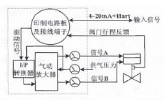 圖1 調(diào)節(jié)閥控制原理圖 2.2 電氣定位器控制原理 FISHERDVC6010電氣定位器是基于微處理器將電信號轉(zhuǎn)換成氣動信號的儀表。微處理器將給定值與閥門形成的反饋值進行比較,當出現(xiàn)偏差時,微處理器依據(jù)偏差的大小和方向輸出一個驅(qū)動信號。該驅(qū)動信號通過電氣(I/P)轉(zhuǎn)換器,將電信號轉(zhuǎn)換成氣動信號,再通過氣動放大器放大,按照位置方向輸出給氣動執(zhí)行機構。執(zhí)行機構依據(jù)接收的信號A或者信號B進行上下移動,從而使閥門開度在全行程上進行移動。電氣定位器控制原理圖如圖2所示。