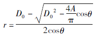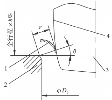 確定閥門流量系數(shù)CV值后按式(3)計(jì)算出A0,然后根據(jù)式(4)針對(duì)閥瓣某一閥瓣開度h%時(shí)計(jì)算出調(diào)節(jié)閥的閥瓣型面所形成的等效節(jié)流流路的面積A。按照?qǐng)D1所示閥座密封點(diǎn)處畫出一條射線段使其與水平夾角為θ,長(zhǎng)度為r。假設(shè)此點(diǎn)剛好為此閥瓣開度h%時(shí)閥瓣型面上的點(diǎn),即此射線段所形成的圓臺(tái)側(cè)面積與A值一樣,即有