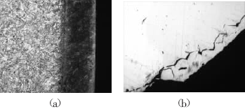 分別在調(diào)節(jié)閥桿端面上制備金相樣品,金相組織如圖3(a)、(b)所示。在金相樣品的邊緣觀察到氮化層,氮化層深為0。25~0。38mm,在氮化層邊緣及內(nèi)部有許多微小的顯微裂紋,對(duì)調(diào)節(jié)閥桿的螺紋處進(jìn)行腐蝕,發(fā)現(xiàn)螺紋處局部有氮化的痕跡,且被氮化的螺紋處大都有螺紋剝落發(fā)生,調(diào)節(jié)閥桿金相樣品的晶粒度都為4級(jí),金相組織為回火索氏體。