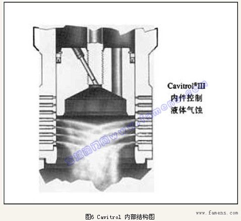 b)選用Fisher公司的Cavitrol Trim III內(nèi)件,如圖6,它采用二級(jí)對(duì)液體進(jìn)行分級(jí)降壓,特殊形狀的孔道和鉆孔技術(shù)使介質(zhì)壓力保持在汽化壓力之上防止氣蝕產(chǎn)生;