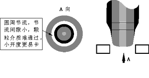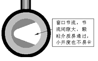 | 介質(zhì)流經(jīng)節(jié)流口時(shí),在同樣的節(jié)流面積條件下,如果節(jié)流間隙小,不干凈介質(zhì)不易通過(guò), 容易堵塞;反之,則不易堵塞。對(duì)柱塞型閥芯(見(jiàn)圖六),它的節(jié)流面積分布在圓周上, 其節(jié)流間隙大概等于面積除以圓周長(zhǎng);再看窗口型閥芯(見(jiàn)圖七),其面積分布在窗口上 而不是在整個(gè)圓周上,所以其間隙大,顆粒很容易通過(guò)。由此可見(jiàn),節(jié)流面積越集中(不是圓周分布),節(jié)流間隙越大,防堵性能就越好。這樣的典型產(chǎn)品有“V”型球閥、全功能超輕型調(diào)節(jié)閥等。尤其在小開(kāi)度工作時(shí),前者的節(jié)流間隙更小,更易堵卡;后者集中在“V”形口的尖端部份,面積集中,充分顯示了“V”形節(jié)流的防堵優(yōu)勢(shì)。 | ||||||