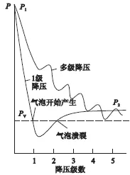 高壓液體流經(jīng)節(jié)流孔時,閥座相當于節(jié)流孔板(圖4),靜壓能與動壓能相互轉(zhuǎn)換,流速的增加導(dǎo)致壓力降低。當壓力降低至等于或低于該液體在入口溫度下的汽化壓力PV時,液體中的氣核即膨脹而形成汽泡。流過節(jié)流面后,在寬敞的下游流道中流速下降,壓力回升。當壓力回升至P2時,并≥PV時,汽泡潰裂,這即是汽化過程。汽泡潰裂時,釋放出巨大的能量,對閥座、閥瓣等節(jié)流元件產(chǎn)生破壞即汽蝕。汽蝕的破壞力很大,一般的閥門在汽化條件下,運行一定時間后即遭受嚴重汽蝕,致使閥座泄漏量高達額定流量的30%以上,調(diào)節(jié)閥完全喪失調(diào)節(jié)控制功能。
