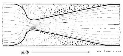 圖1就是一個(gè)在節(jié)流孔后產(chǎn)生空化作用的示意圖。許多氣泡集中在節(jié)流孔閥后,自然影響了流量的增加,產(chǎn)生了阻塞情況,因此,閃蒸和空化作用產(chǎn)生的前后的計(jì)算公式必然不同。在產(chǎn)生空化作用時(shí),在縮流處的后面,由于壓力恢復(fù),升高的壓力壓縮氣泡,達(dá)到臨界尺寸的氣泡開始變?yōu)闄E圓形,接著,在上游表面開始變平,然后突然爆裂,所有的能量集中在破裂點(diǎn)上,產(chǎn)生極大的沖擊力