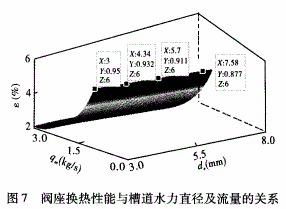 顯然,換熱性能ε與槽道的水力直徑de及冷卻水流量qm密切相關(guān)。為保證槽道內(nèi)冷卻水為單相流,ε的最大值為6%。以de為X軸,qm為Y軸,通過(guò)Matlab擬合出關(guān)于換熱性能ε的三維曲面,如圖7所示。分析換熱性能時(shí),應(yīng)控制槽道水力直徑不得低于3mm,以保證能采用常規(guī)理論計(jì)算,且不得高于8mm,以保證閥座不被高溫氧化。