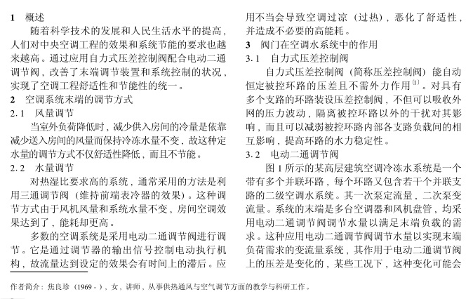 結合中央空調系統(tǒng)的調節(jié)特點及電動二通調節(jié)閥的工作特性 , 采用自力式壓差控制閥配合電動二通調節(jié)閥使用 , 發(fā)揮了電動二通調節(jié)閥的調節(jié)優(yōu)勢 , 實現(xiàn)空調水系統(tǒng)根據(jù)用戶需求變流量 , 從而達到舒適和節(jié)能的目的。